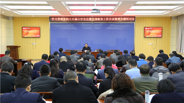 为深入贯彻落实十八届六中全会、全国教育工作会议精神,聚焦学校发展规划和正在推进的中心工作,切实加强学校中层干部的思想、能力和作风建设,3月17日—18日,学校在第一学术报告厅举办中层干部学习贯彻党的十八届六中全会暨全国教育工作会议精神专题研讨会。全体在家校领导出席会议,全体处级干部参加会议。